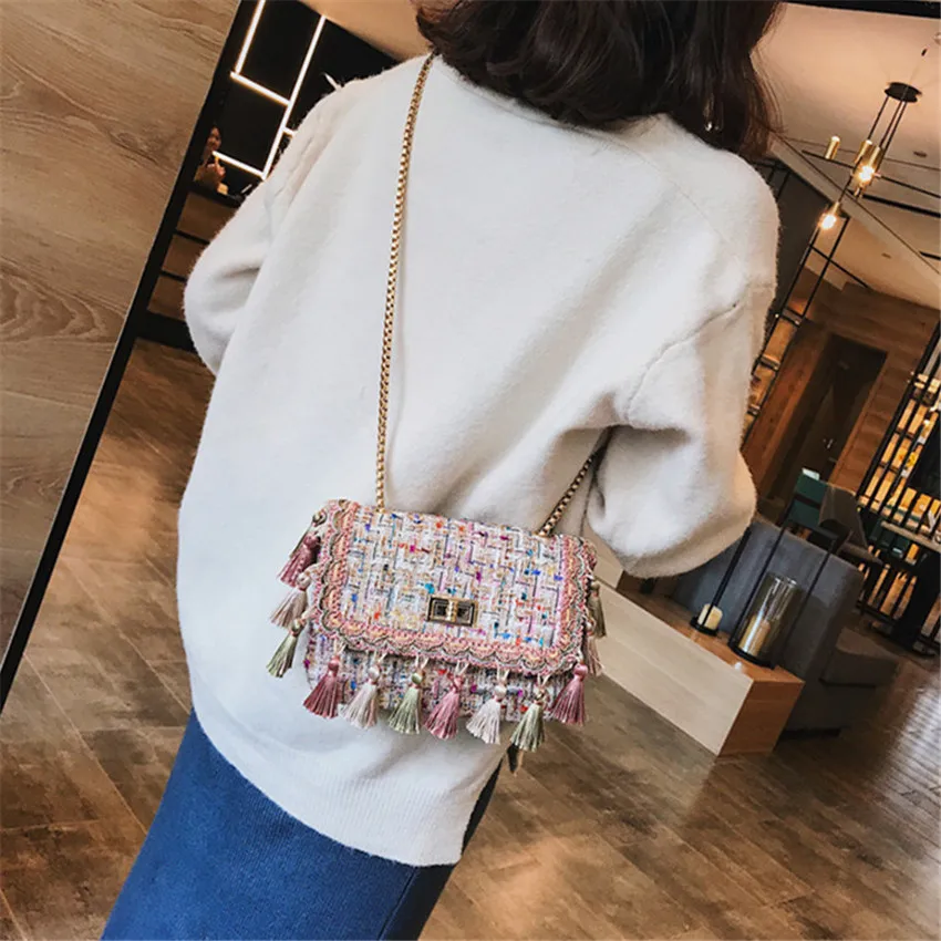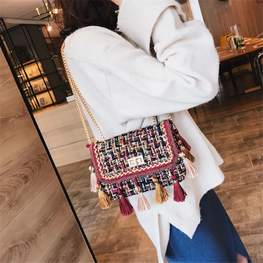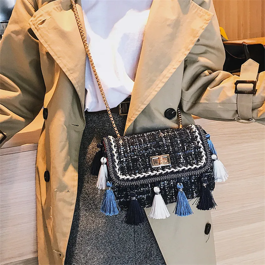 Product Name: TOYOOSKY 2018 Ins Hot Fashion Wol Vrouwen Handtas Kwastje Plaid Messenger Bag Vintage Dames Flap Hoge Kwaliteit Keten Schoudertas